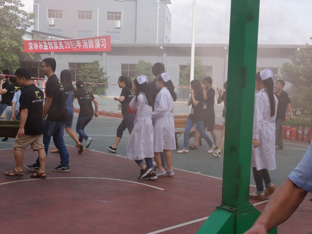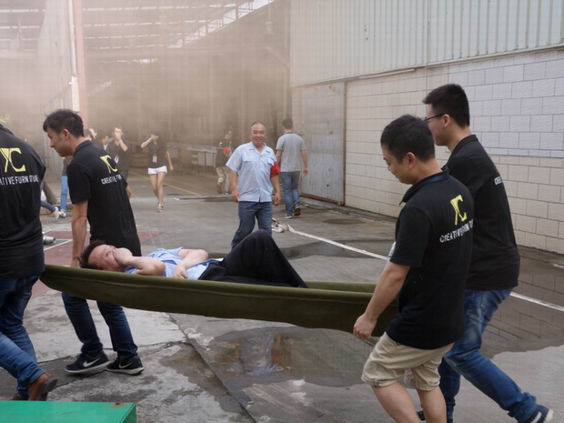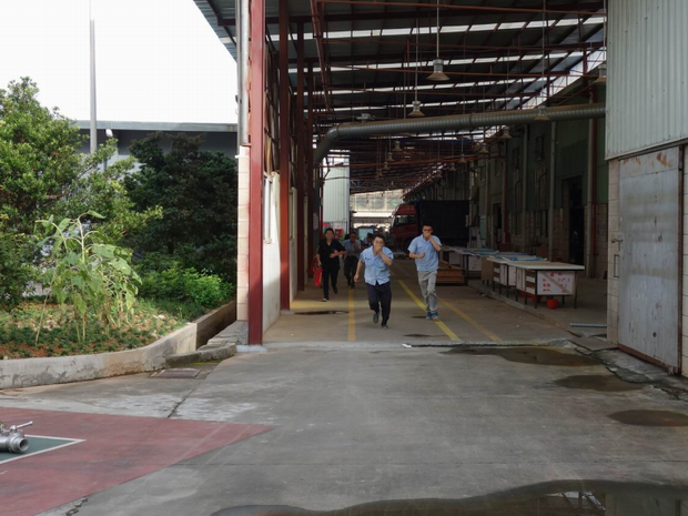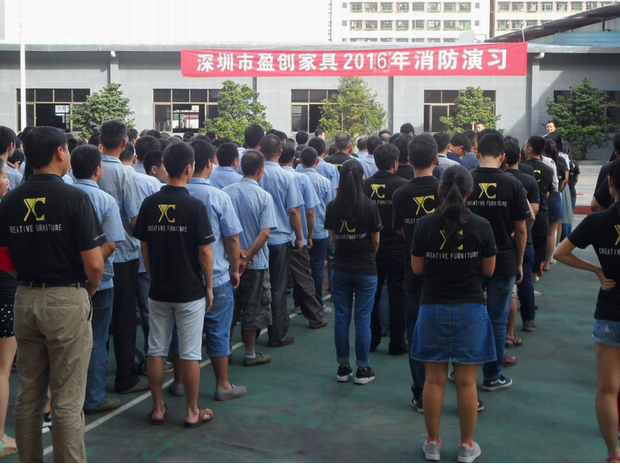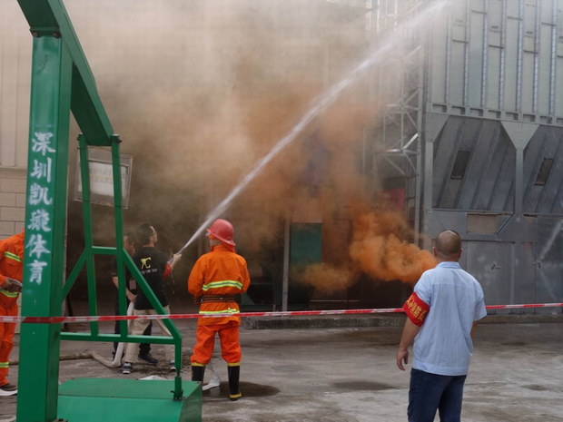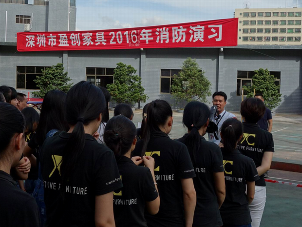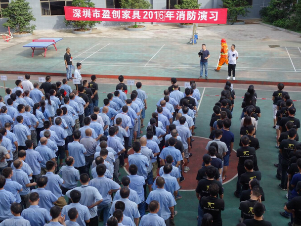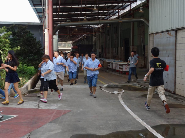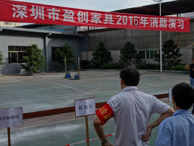 2016年6月26日16:40分,總指揮下達(dá)了演練開(kāi)始,木工車(chē)間吸塵塔粉塵未及時(shí)清理產(chǎn)生火情,事故現(xiàn)場(chǎng)人員立即組成報(bào)警組發(fā)出火警報(bào)警信號(hào)。各演練工作組在聽(tīng)到指令后,迅速到位,參加演練的義務(wù)消防員和工作人員全部佩戴消防演習(xí)紅袖章,疏散組在最短的時(shí)間內(nèi),于車(chē)間內(nèi)、樓梯間及安全出口處,通過(guò)口令加手勢(shì),指揮員工從指定路線(xiàn)進(jìn)行有秩序地疏散;把現(xiàn)場(chǎng)所有人員,快捷有序地疏散到安全地帶(公司宿舍前籃球場(chǎng));滅火救援組第一組人員在一分鐘到達(dá)現(xiàn)場(chǎng)使用滅火器、消防栓進(jìn)行滅火,滅火二組在3分鐘內(nèi)穿著裝,佩戴空氣呼吸器到達(dá)現(xiàn)場(chǎng)進(jìn)行現(xiàn)場(chǎng)搜救及滅火救援;通訊警戒組按照人員分工,確保通訊、警戒、引導(dǎo)消防車(chē)輛、阻止無(wú)關(guān)人員進(jìn)入火場(chǎng),確保了救援行動(dòng)的正常進(jìn)行;救護(hù)保障組準(zhǔn)備了救護(hù)器材,對(duì)受傷人員及時(shí)救護(hù)及后勤保障。